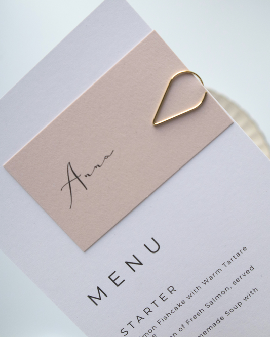 Gold Teardrop Clip Wedding Menu with Place Name in Pink