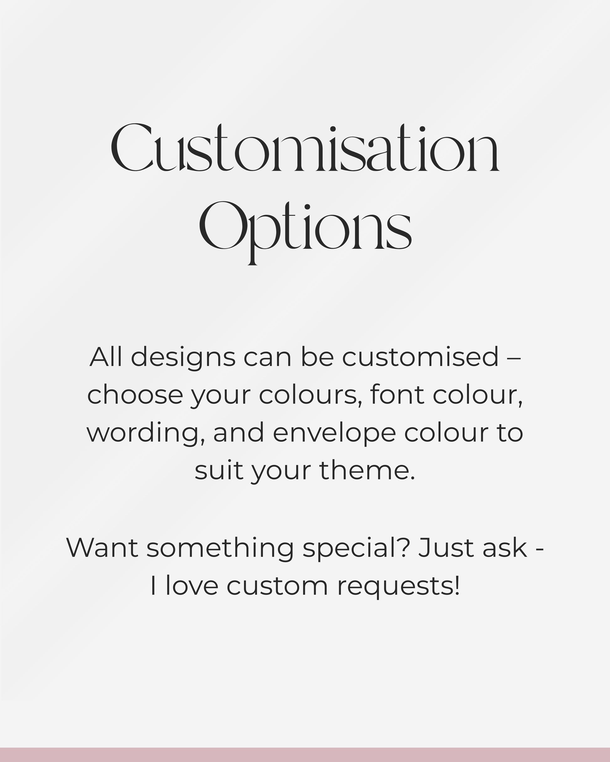 From colours and fonts to bespoke designs, customise every detail of your stationery. Whether you have a specific vision in mind or need a little guidance, we're here to help. Get in touch today to bring your vision to life!